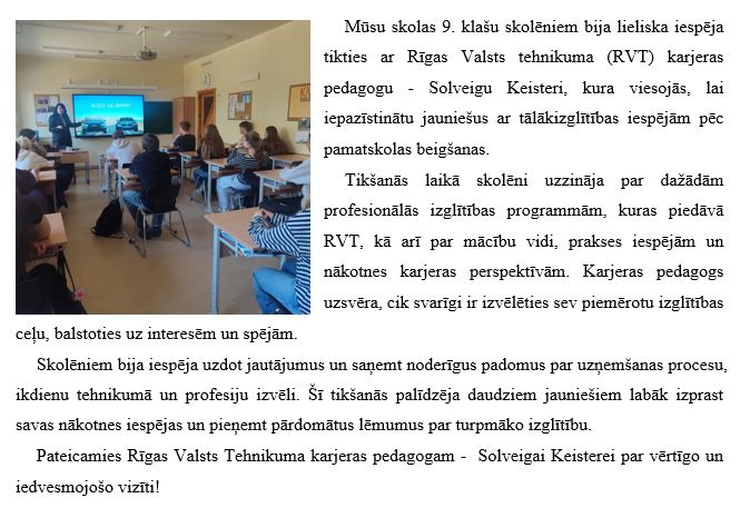 Rīgas Valsts tehnikuma karjeras pedagogs pie 9.klašu skolēniem