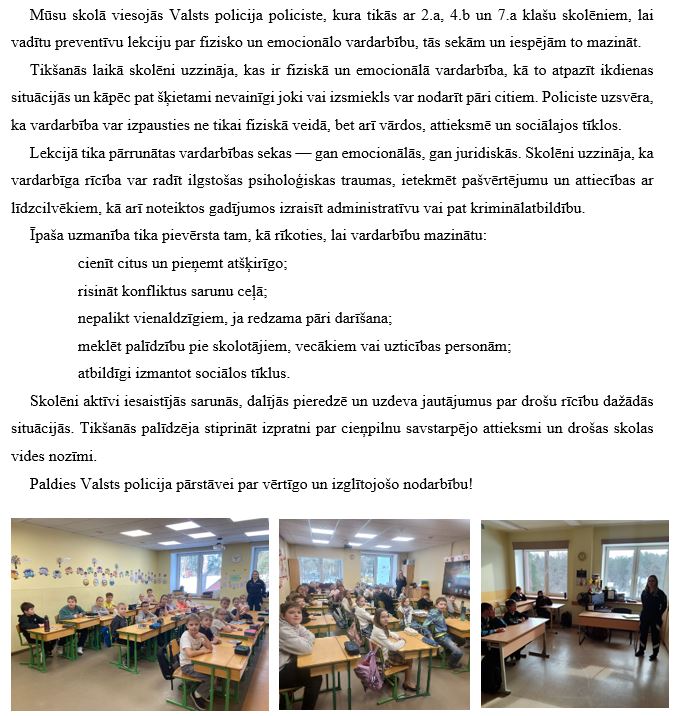 Valsts policijas pārstāves lekcija par drošību un cieņpilnām attiecībām skolā