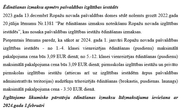 Par ēdināšanas izmaksām pašvaldības izglītības iestādēs un izglītojamo likumisko pārstāvju līdzmaksājuma ieviešanas termiņa atlikšanu uz 2024.gada 1.februāri
